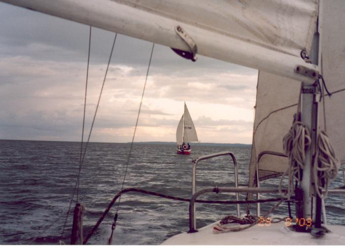 Ok. godz. 1110 odbijamy od kei i idziemy do farwateru na wiatr (ok. 5oB z NWW), potem odpadamy. Pogoda jest ładna, słoneczna. Przed granicą wyjątkowo dużo sieci wyjątkowo blisko farwateru -- ostatnie zasieki dla polskich ryb, które mogłyby chcieć wybrać wolność w obcym kraju. Do boi granicznej oznaczonej krzyżykiem dochodzimy o 1230. Wg locji, mapy i opowieści różnych ludzi powinna ona należeć do długiego ciągu boi z krzyżykami wyznaczających granicę -- jednak tak nie jest: oprócz naszej boi nie widzimy żadnych innych. Może zabrali je do mycia? Po polskiej stronie stoi stateczek WOP-owski a obok niego motorówka. Nami się nie interesują. Przypuszczalnie dostali cynk na nasz temat z Fromborka i uważają, że wszystko się zgadza.